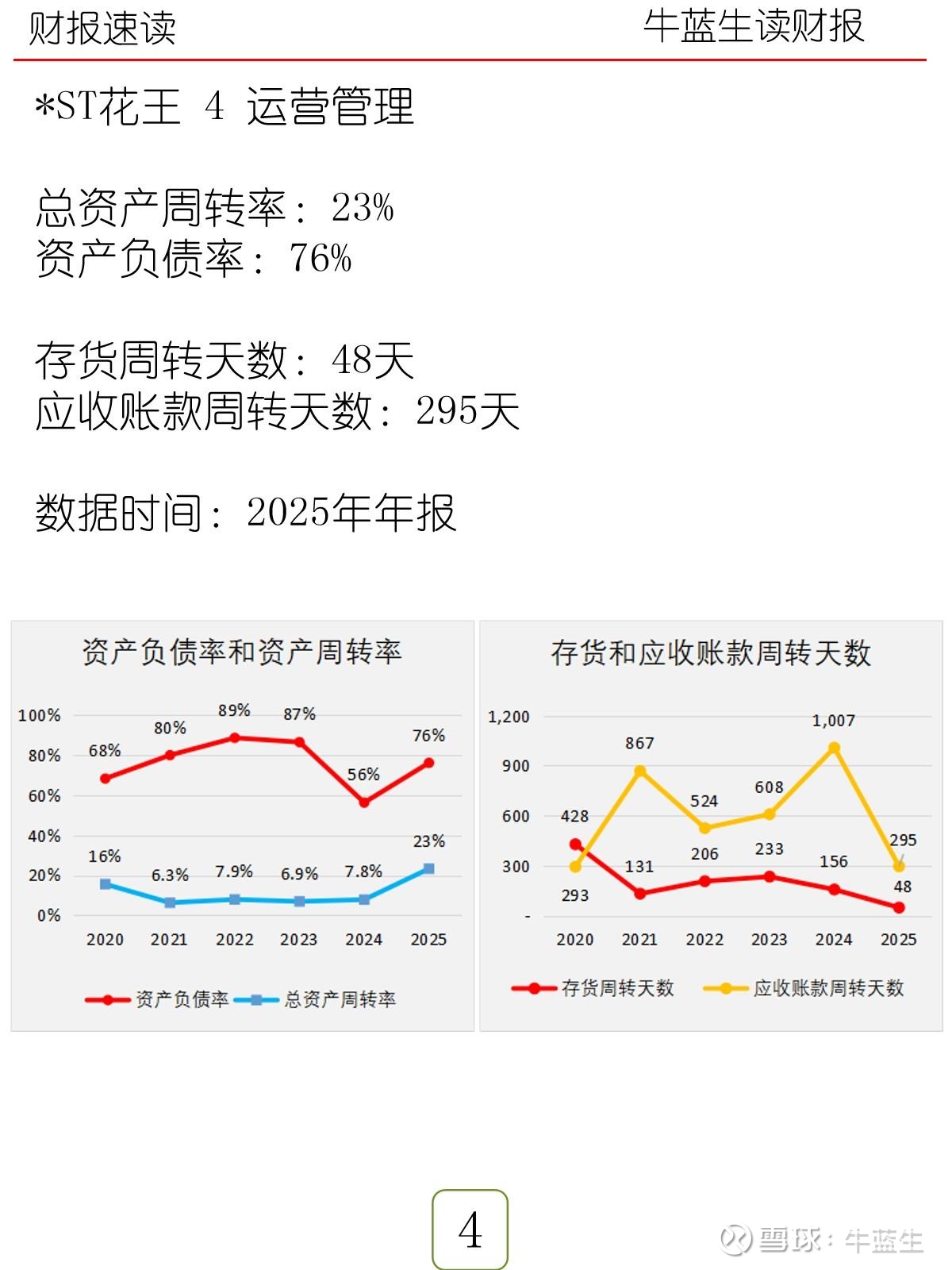 - 运营:总资产周转率23%,资产负债率76%;存货周转48天,应收账款周转295天