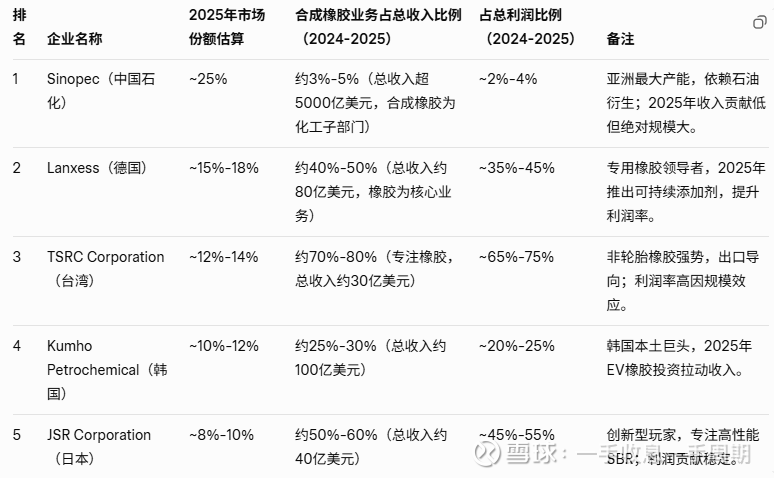 化工合成橡胶:合成橡胶和化学品供应集中(全球前5家占70%),价格波动时能向下游转嫁(e.g., 2023年橡胶价格涨20%,固特异等需全额吸收)。根据2025年最新行业报告,合成橡胶市场规模约为348.3亿美元(CAGR 4.21%),全球前5家企业确实占据70%+份额(CR5指数约75%,主要因产能集中于亚洲和欧美化工巨头)。这些企业主导丁苯橡胶(SBR)、丁腈橡胶(NBR)和乙丙橡胶(EPDM)等关键品类,受益于汽车和轮胎需求(EV轮胎占比上升至30%)。前5家名单:
