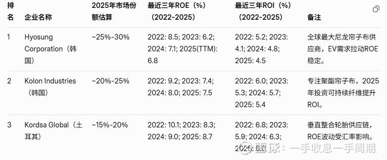 纺织帘子布:寡头市场(CR3>60%),尼龙帘子布需求CAGR 7.1%;提供强度/耐热,EV轮胎放大议价(市场9.3亿美元)。纺织帘子布(tire cord fabric)市场规模2025年约15.6万吨(CAGR 2.92%),高度寡头化,CR3指数>60%(约65%-70%,亚洲企业主导尼龙/聚酯帘子布,占市场68%)。前3家基于全球销量和产能排序: