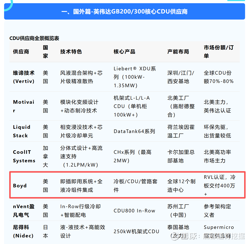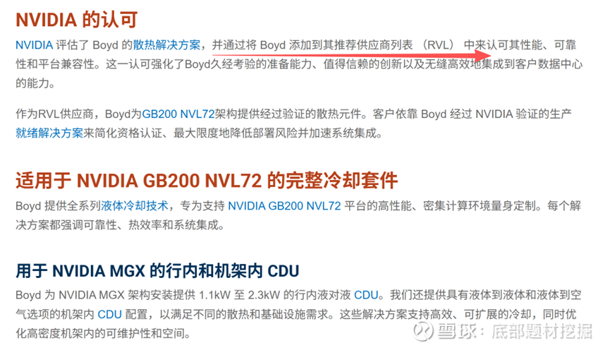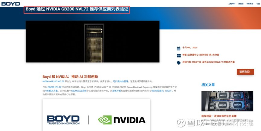2、Boyd是英伟达AI液冷供应链的“战略核心”:作为英伟达GB200 NVL72等旗舰平台官方推荐供应商(进入RVL清单),Boyd提供全系列液冷解决方案,是英伟达AI算力落地的“关键支撑”。
