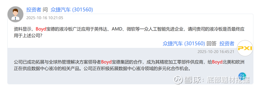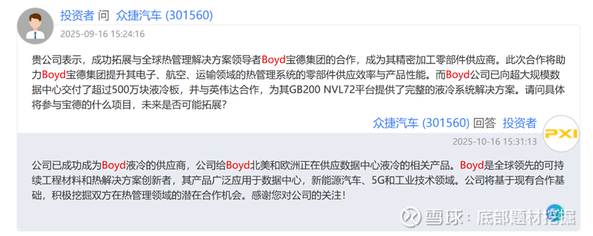 根据公司2025年10月以来的投资者交流,众捷汽车已正式成为Boyd的精密加工零部件供应商,向Boyd北美、欧洲业务供应数据中心液冷相关精密零部件,最终应用于英伟达、AMD、微软等AI巨头的服务器与数据中心。