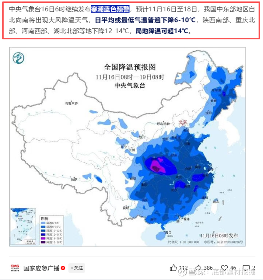 中央气象台11月16日发布的寒潮蓝色预警显示,本轮降温强度大、范围广,中东部地区气温普降6-14℃。