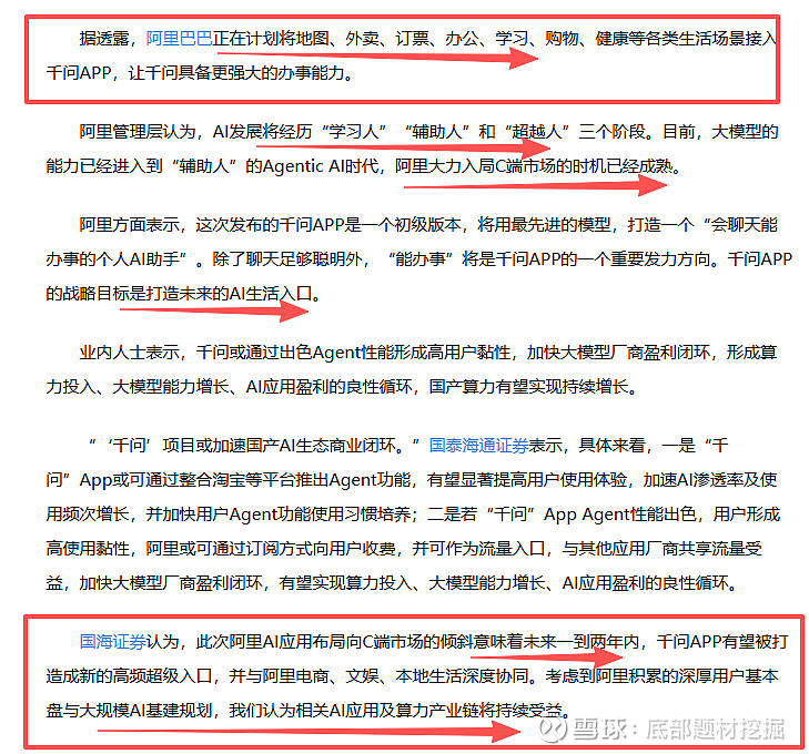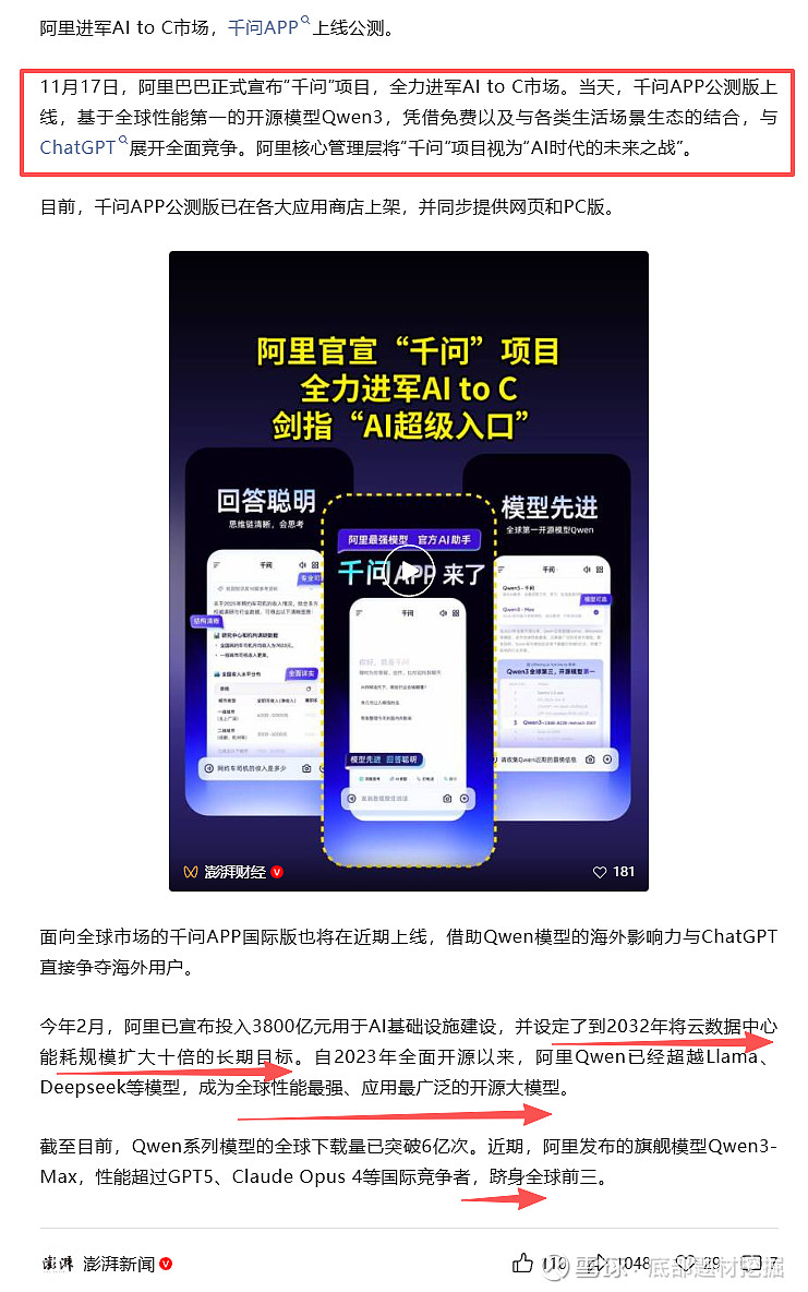 结论:千问APP的发布是阿里AI战略从技术储备向生态运营转折的关键信号。石基信息、值得买、创业黑马、杭钢股份、数据港分别卡位酒旅、内容、中小企业服务、算力基建等核心环节,未来随千问生态扩张,业绩与估值具备提升空间。