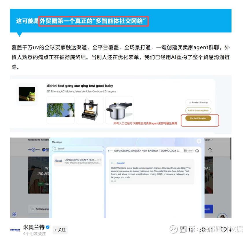公司的“多智能体社交网络”,本质是为外贸场景定制的“AI协同生态”: