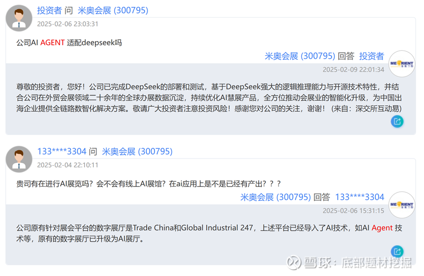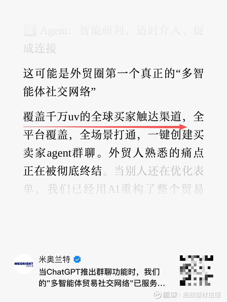 1、AI应用从“通用竞赛”转向“垂直落地”,米奥会展率先攻克外贸场景痛点:当ChatGPT刚推出群聊功能时,公司已在外贸领域落地“多智能体贸易社交网络”,实锤“GPT群聊第一股”,先发优势显著。