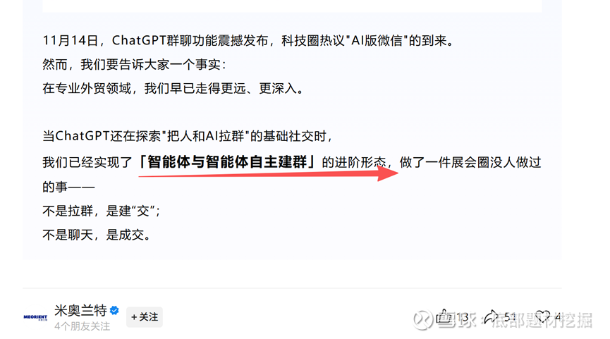 当ChatGPT推群聊时,米奥已在外贸圈“跑通闭环”。11月14日,ChatGPT正式推出群聊功能,科技圈热议“AI版微信”;但鲜有人知的是,米奥会展的“多智能体贸易社交网络”已服务全球买家三个月。