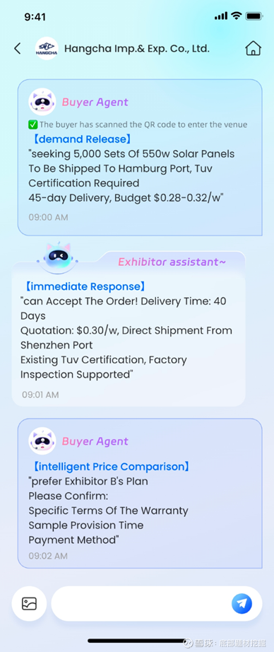 2、不是“聊天群”,是“成交场”:区别于通用AI的“人与AI交互”,公司以“买家需求捕手+卖家数字分身+交易智能桥梁”三大智能体协同,解决外贸跨语言、跨时区、信息差的核心痛点,已服务全球买家三个月。
