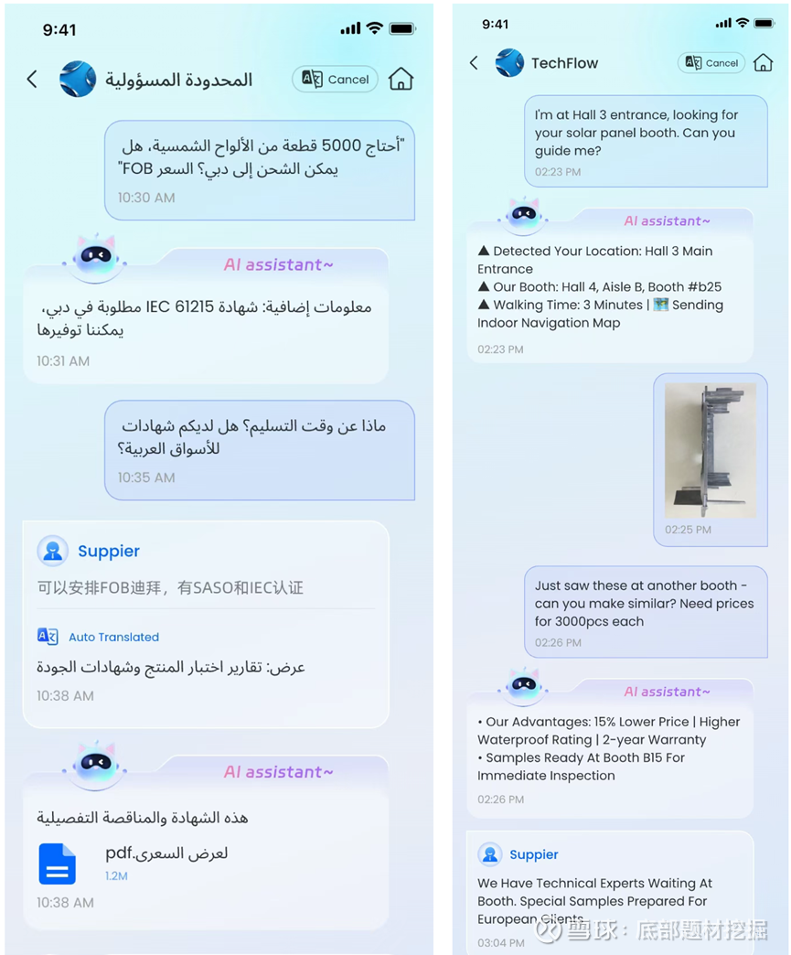 展商侧:数字分身:7×24小时永续在线,用买家母语回复询盘(支持16+语种实时互译),甚至能模拟展商的语气(比如“我们工厂有10年T恤生产经验,样品3天寄出”);