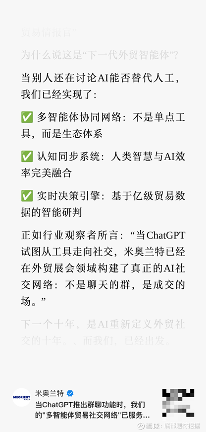 米奥会展的核心逻辑很清晰:用AI解决外贸的“真痛点”,从“连接”升级为“成交”。当ChatGPT还在探索群聊的“社交属性”时,公司已经在外贸圈实现了“AI的生意属性”——不是“聊得热闹”,是“赚得实在”。
