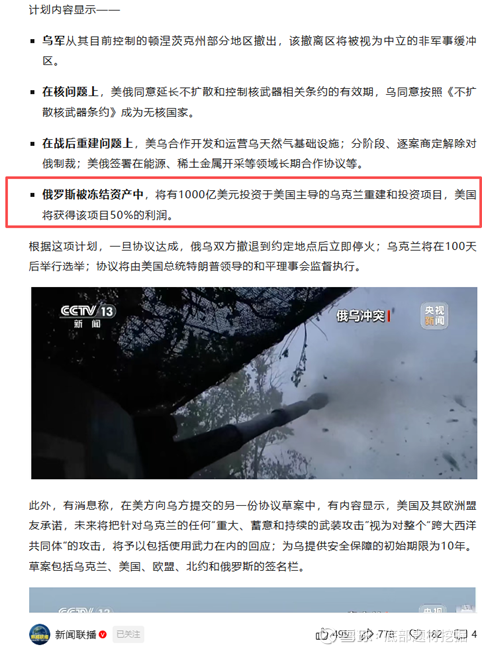 重建资金机制已现雏形。计划中提及被冻结的俄罗斯资产(约1000亿美元)将投入美国主导的重建项目。尽管存在争议,但这为重建提供了初始资金保障。欧盟也已推出500亿欧元宏观财政援助,能源与交通基建占重建资金总投入的60%。