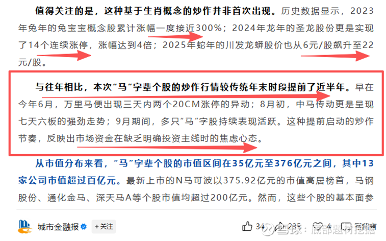 与往年相比,本次“马”字辈行情提前近半年启动。6月份万里马便出现三天内两个20CM涨停,8初中马传动呈现七天六板走势。这种提前启动反映出市场缺乏明确主线时的资金焦虑,但也意味着行情可能具有更长的持续性和更大的波动性。从历史规律看,11月至次年1月是生肖概念股的主升浪阶段,当前正处于第二波拉升的前夜。
