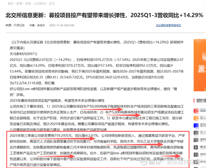 公司募投项目年产50,000吨电子陶瓷粉体材料生产线已逐步建成投产;年产5,000吨高导热球形氧化铝生产线已全部转固,处于试生产及客户送样阶段。随着产能释放,公司有望迎来业绩拐点。2025年前三季度公司营收2.07亿元(+14.29%),受募投项目结项带来折旧影响,归母净利润1070.27万元(-57.54%),但这一影响为短期因素。