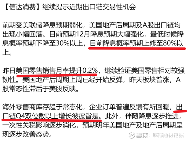 2、信达消费最新提示重视出口链交易性机会!目前美国12月降息概率预期上修至80%以上,企业订单普遍反馈有所回暖,出口链Q4双位数以上增长彼彼皆是。