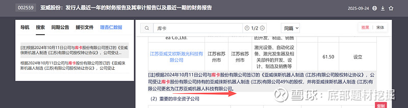 2024年10月11日公司与库卡股份有限公司签订的《亚威徕斯机器人制造 (江苏)有限公司股权转让协议》,公司受让库卡股份有限公司持有的亚威徕斯机器人制造 (江苏)有限公司49%的股权,并将亚威徕斯机器人制造 (江苏)有限公司更名为江苏亚威机器人科技有限公司。