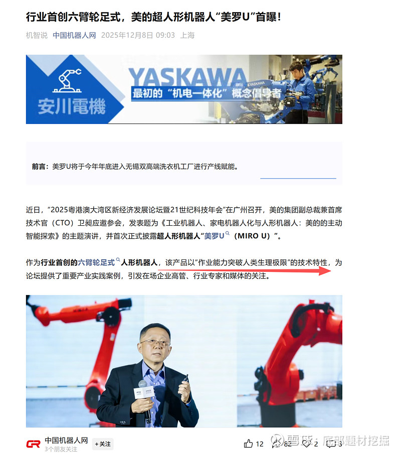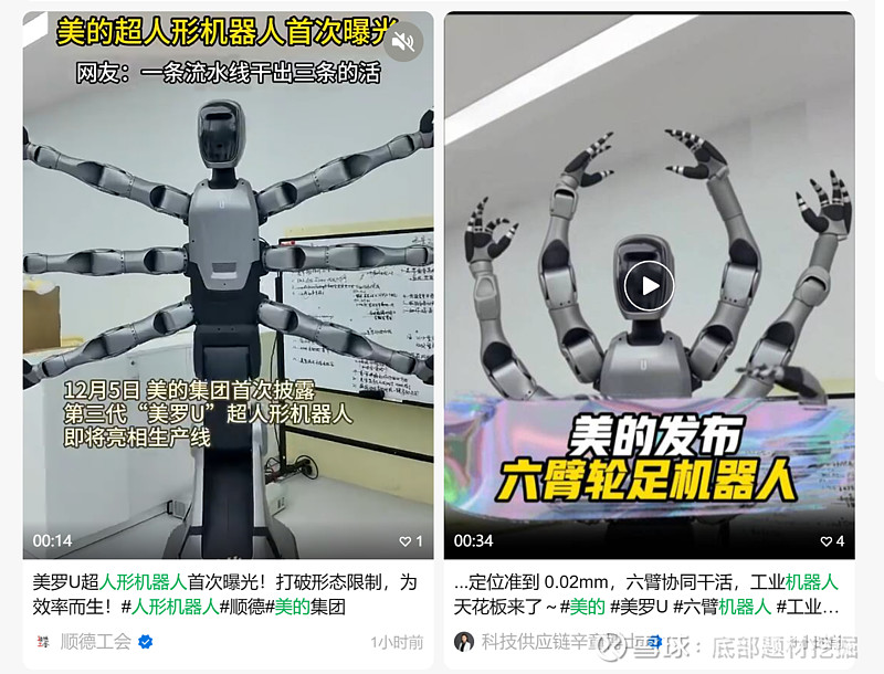 1、事件催化:技术落地与产业进程双提速。 2025年12月,美的集团在“粤港澳大湾区新经济发展论坛”上正式发布行业首创的六臂轮足式超人形机器人“美罗U”,标志着其机器人战略从研发储备进入规模化场景应用的关键阶段。产品将于年底进入工厂产线,技术价值转化路径清晰,为产业链带来明确增量预期。