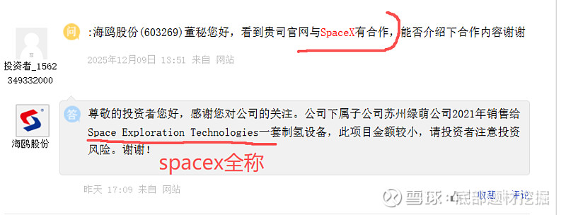 根据公司2025年10月15日在投资者互动平台的明确回复,其下属子公司苏州绿萌氢能科技有限公司在2021年向Space Exploration Technologies(即SpaceX)销售了制氢设备。它标志着海鸥股份通过其氢能子公司,成功打入了SpaceX的供应链体系,获得了这家以严苛著称的科技巨头的认可。在A股市场中,能够提供如此明确业务关联证据的公司凤毛麟角。