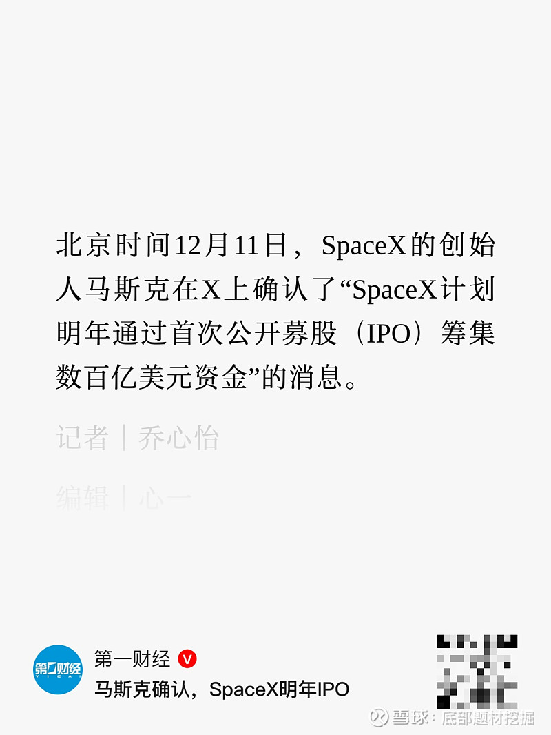 北京时间12月11日,SpaceX创始人埃隆·马斯克在社交媒体平台X上确认,公司计划于2026年中后期进行首次公开募股(IPO),目标估值高达约1.5万亿美元,预计募集资金超过400亿美元,有望成为人类商业史上规模最大的IPO。