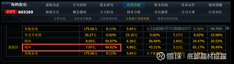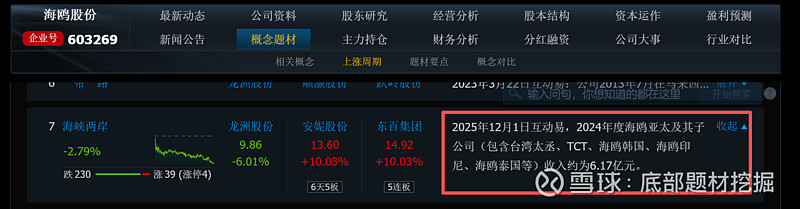 根据公司2025年12月1日在互动易的回复,其海外平台“海鸥亚太”及其子公司(包含台湾太丞、TCT以及海鸥韩国、印尼、泰国等)在2024年度贡献了约6.17亿元的收入。基于此,同花顺F10已为其新增“海峡两岸”概念。