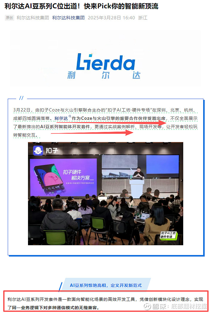 受益路径:在“AI+行业”论坛(如AI+工业、AI+能源)中展示的行业解决方案,其背后往往需要利尔达这样的公司提供硬件支撑和集成服务。公司能够将豆包大模型的AI能力与具体的传感器、控制器、通信模块结合,打包成面向垂直行业的标准化AI硬件解决方案,实现从“卖模组”到“卖方案”的价值跃升。