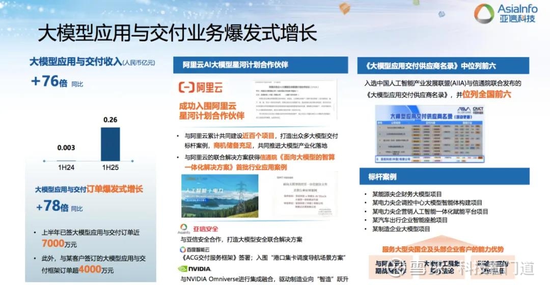 具体而言,亚信科技在AI大模型应用与交付业务的增长飞快,虽然基数不大,现如今的营收规模上半年只有2600万,但订单金额上半年已经超过了7千万。“尤其是亚信科技作为阿里云星河计划的合作伙伴,目前已经跟阿里一起打造了超百个大模型的交付项目。”高念书介绍说,其中在能源、制造等行业都打造了大模型交付的标杆,在国内大模型交付领域稳固在第一阵营。”