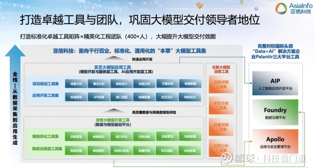据了解,亚信科技将其对标Palantir三大平台Foundry、AIP、Apollo的工具集和方法论归纳为底层的龙骨大模型开发工具集、中层的石斛大模型运营维护工具集和上层的灵芝大模型应用工具集,交付和开发团队已经接近400人的规模。三组工具集越迭代越强,在不同行业里能够通用,所谓“工具的效能发挥越大,毛利率会越高”。