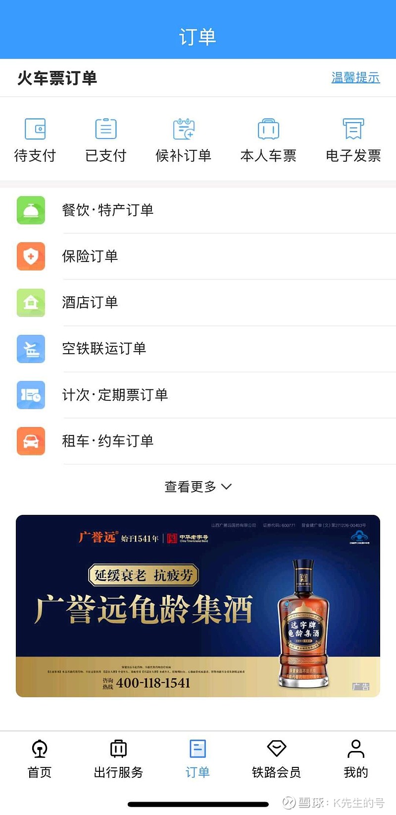 $广誉远(SH600771)$广誉远与12306(铁路订票系统)达成合作中秋国庆双节同庆之际,广誉远龟龄集酒登陆中国铁路12306官方平台,于万千旅客的旅途中传递健康祝福。此次广告投放精准触达双节期间通过铁路出行的广大旅客,覆盖了12306客户端开屏、订单详情页及订单查询页等核心流量入口。来源:广誉远官微,如有侵权,请联系删除