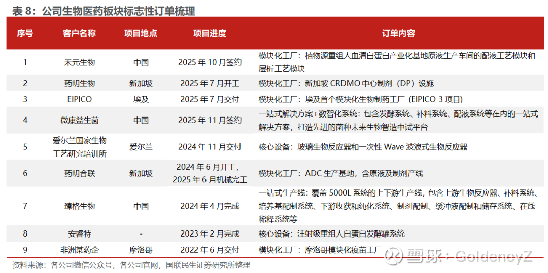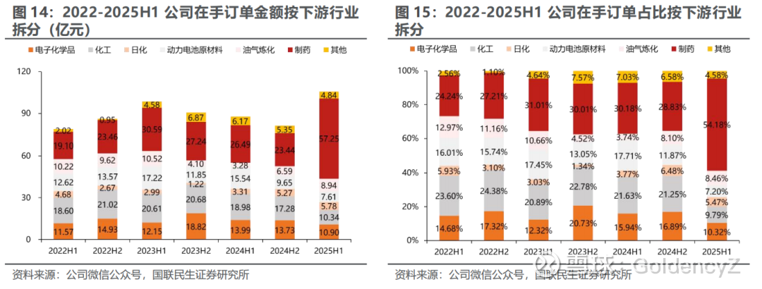 公司承接订单主要来源于制药、化工、日化、动力电池、油气炼化及电子化学品等多个行业,近期也拓展至数据中心、新能源、半导体等细分领域:1)制药:公司利用模块化建设优势为全球制药客户提供高效的生产解决方案,提供产品包括生物反应器、发酵罐、配液系统等;2)动力电池:公司是新能源锂电池扩产的重要参与者,并积极布局固态电池及半固态电池的技术研发与应用,凭借自研与合作的技术储备,推进下一代电池产业化。3)新能源:公司深度参与“绿醇、绿氨、绿氢”等低碳燃料相关投资建设,与客户联合研发并提供核心设备、定制工程方案,支持从研发到商业化的全流程。4)数据中心:公司通过模块化工厂与绿色技术,推动新型储能系统应用及数据中心设备更新迭代,助力客户节能降本。5)半导体:公司为全球半导体材料企业提供从实验室到量产的一站式工程化解决方案,包括高纯湿电子化学品生产装置、光刻胶调配系统等。