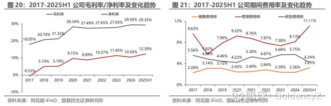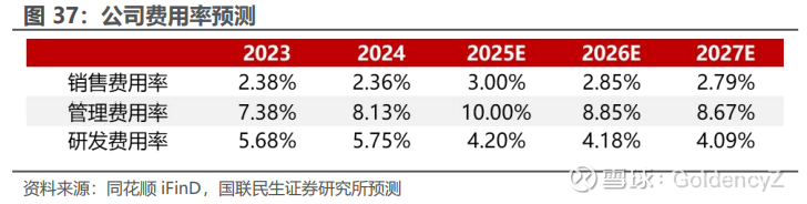 1、销售费用率:公司销售费用率相对稳定,2025H1销售费用率为3.23%,后续有望受益于收入增长逐步摊薄。我们预测 2025-2027 年销售费用率分别为 3.00%、2.85%、2.79%。