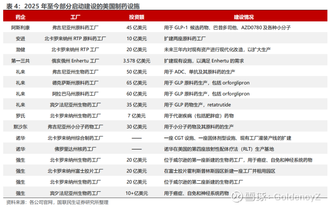 部分药企已启动美国制药产能建设,单个工厂投资额可达数十亿美元。2025年以来,强生、礼来、阿斯利康、默沙东等药企已启动美国制药产能建设,相关投资额合计约400亿美元,单个工厂投资额最高可达65亿美元。