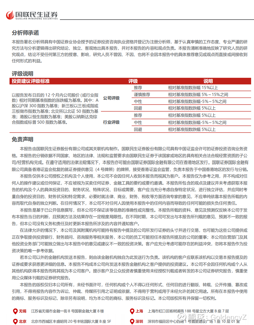 本平台及国联民生证券研究报告所载资料的来源及观点的出处皆被国联民生证券认为可靠,但国联民生证券不对其可靠性、准确性、时效性或完整性做出任何保证。本平台推送内容仅反映国联民生证券研究人员于发出完整报告当日的判断,本平台所载的资料、意见及推测有可能因发布日后的各种因素变化而不再准确或失效,国联民生证券不承担更新不准确或过时的资料、意见及推测的义务,在对相关信息进行更新时亦不会另行通知。在任何情况下,本平台所载信息、意见不构成对任何人的投资建议,所述证券或金融工具买卖的出价或征价,评级、目标价、估值、盈利预测等分析判断亦不构成对具体证券或金融工具在具体价位、具体时点、具体市场表现的投资建议。本平台所包含的观点及建议并未考虑获取本平台包含信息的机构及个人的具体投资目的、财务状况、特殊状况、目标或需要,客户应当充分考虑自身特定状况,进行独立评估,并应同时考量自身的投资目的、财务状况和特定需求,必要时就法律、商业、财务、税收等方面咨询专家的意见,不应单纯依靠本报告所载的内容而取代自身的独立判断。在法律允许的情况下,国联民生证券及其关联方可能持有本平台推送内容中提及的公司所发行证券的头寸并进行交易,也可能为这些公司提供或正在争取提供投资银行、财务顾问、咨询服务等相关服务。客户应充分考虑可能存在的利益冲突,勿将本平台推送内容作为投资决策的唯一参考依据。对任何直接或间接使用本平台所载信息和内容或者据此进行投资所造成的任何一切后果或损失,国联民生证券及/或其关联人员均不承担任何形式的法律责任。