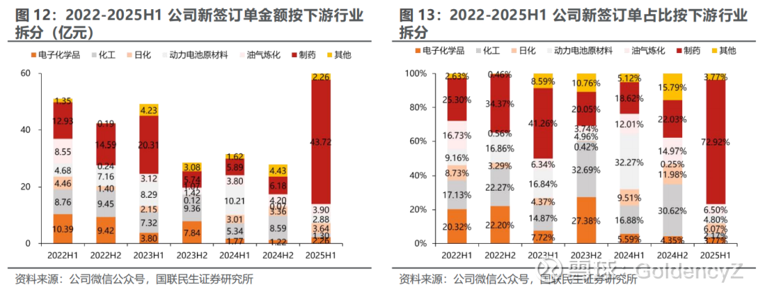 2)新签订单端:2025H1制药行业订单高增,其他行业受周期性波动影响表现分化。新签订单是公司业绩变化的先行指标,公司2025H1新签订单59.96亿元,同比增长89.51%,实现由制药行业驱动的结构性增长。1)制药:受下游需求回暖及重点项目签约带动,2025H1制药行业新签订单43.72亿元,同比大幅增长642.28%,成为驱动公司新一轮增长的核心动力;2)化工、动力电池原材料:受行业周期性需求承压影响,化工新签订单 1.30亿元,同比下降 75.66%;动力电池原材料新签订单 2.88亿元,同比下降 71.79%;3)电子化学品、日化:行业需求稳步回升,电子化学品新签订单 2.26亿元,同比增长 27.68%;日化新签订单 3.64亿元,同比增长20.93%;4)油气炼化:行业需求相对稳定,新签订单 3.90亿元,同比增长2.63%。