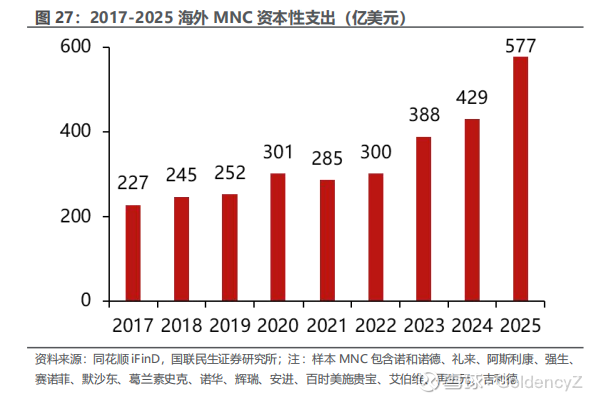新产能建设与存量设备更新需求共振,2025年海外MNC资本性支出创新高。除新建产能带来的制药设备需求以外,由于制药设备自身寿命有限,药企也面临大量存量设备的更新需求。随着技术迭代、监管要求提升以及绿色生产标准的普及,老旧设备的替换将成为制药设备市场的重要驱动因素。2020年至2022年,海外MNC资本性支出放缓,2023年以来资本性支出快速增长,反映了设备更新等资本性支出需求增长。2025年,部分海外MNC(诺和诺德、礼来、阿斯利康、强生、赛诺菲、默沙东、葛兰素史克、诺华、辉瑞、安进、百时美施贵宝、艾伯维、再生元、吉利德)资本性支出总额达577亿美元,同比增幅约34.4%,资本性支出创历史新高,意味着制药设备行业有望在药企存量设备更新与新建产能双重需求驱动下迎来高速增长期。