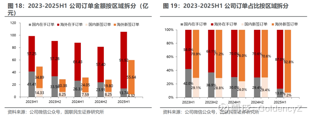 订单端:海外新签订单高增,海外收入占比有望进一步增长。2023年-2024年,公司新签海外订单占比维持约70%,2025H1海外新签订单55.64亿元,占比提升至92.8%。受益于2025H1海外新签订单同比大幅增长131.40%,公司海外收入占比有望进一步增长。