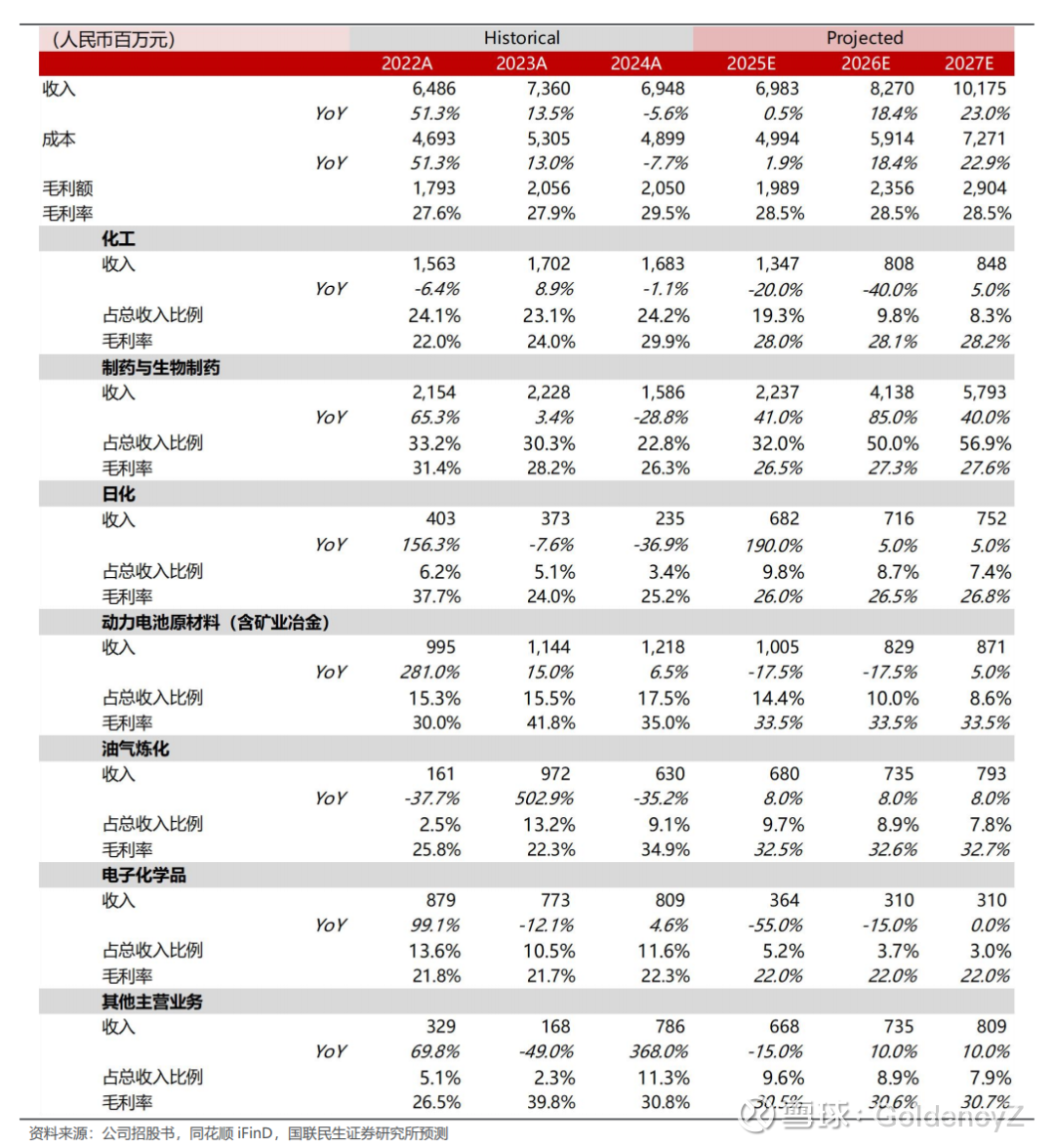 6、电子化学品:公司电子化学品板块包括半导体材料等,行业阶段性调整,但增长空间仍较大。我们预测2025-2027年收入增速分别为-55.0%、-15.0%、0.0%,毛利率分别为22.0%、22.0%、22.0%。