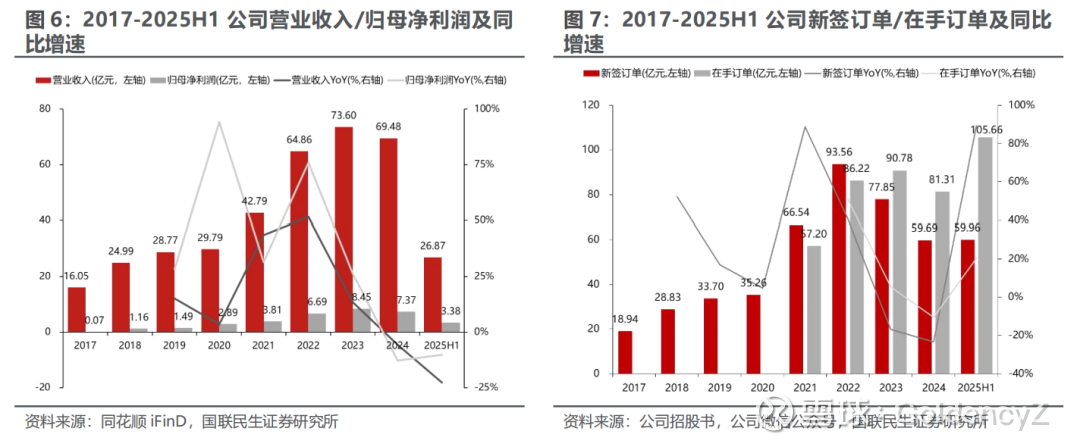 新签订单波动影响业绩表现,2025H1新签订单强劲增长有望驱动业绩触底回升。新签订单是业绩先行指标,下游不同细分领域客户固定资产投资存在周期性,公司通过多元化布局诸多领域平滑周期影响。2017年-2024年,公司营业收入由16.05亿元增长至69.48亿元,CAGR为23.28%;归母净利润由0.07亿元增长至7.37亿元,CAGR为94.11%。2025H1营业收入26.87亿元,同比下滑22.71%;归母净利润3.38亿元,同比下降10.15%。2023年下半年以来,受部分下游客户需求疲软导致新签订单下滑(前期产能扩建过剩)、个别权重订单进度延迟确认等扰动业绩增长节奏。