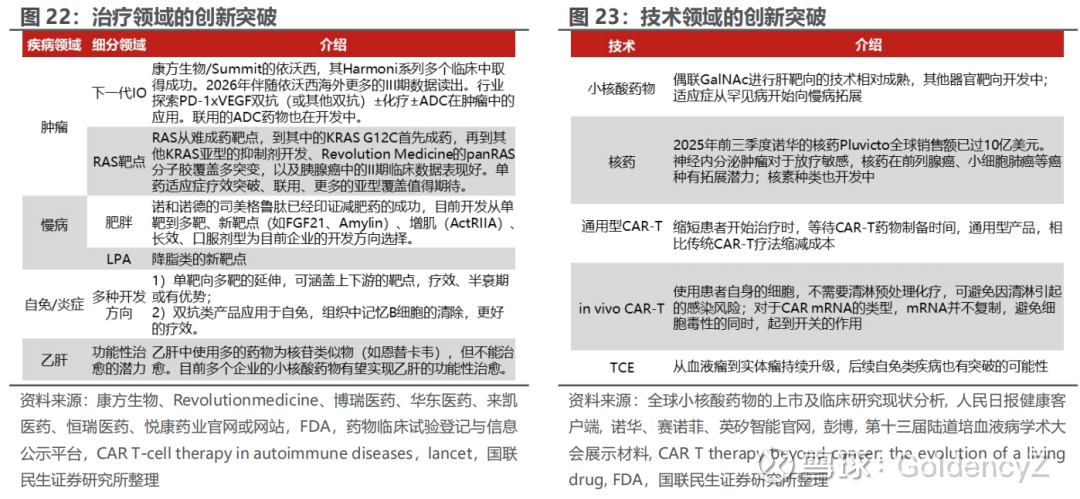 创新疗法突破迭出,为下游制药业持续提供新增量。在疾病治疗维度,肿瘤、慢病、自免/炎症及乙肝等领域均迎来显著突破;在技术平台维度,小核酸药物、TCE、核药、通用型CAR-T、in vivo CAR-T等新型疗法,叠加AI制药技术的深度赋能正加速落地。