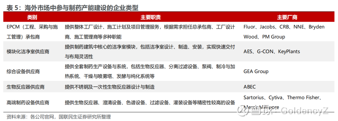 2)模块化洁净室供应商:负责提供制药建筑中核心的洁净室,主要厂商包括AES、G CON、KeyPlants;