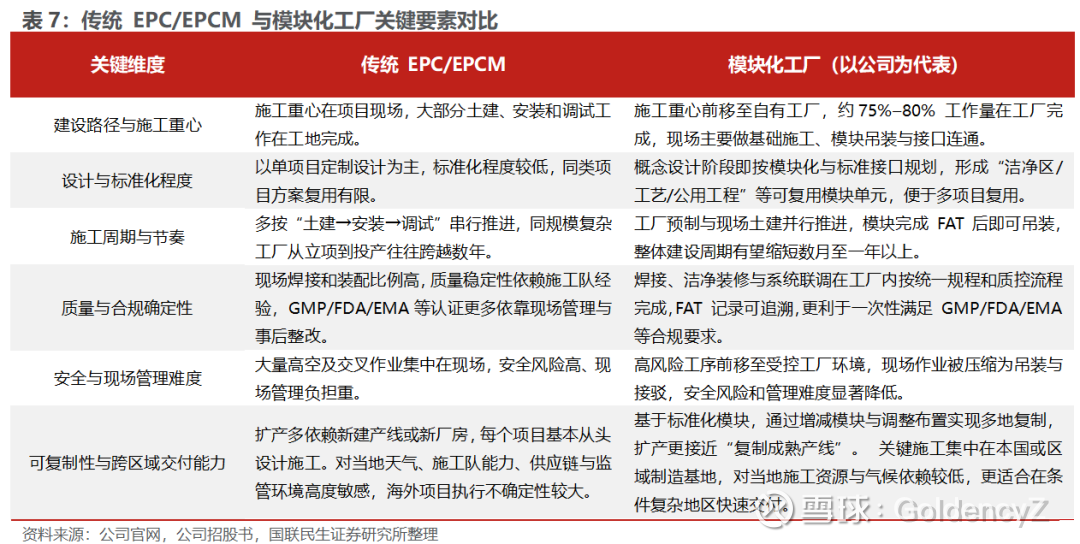 3)模块化工厂构筑核心产品力,全球交付体系与头部客户粘性助力增强差异化竞争力。公司是模块化工厂领域的全球领军企业,模块化工厂具备快速交付、灵活扩展、质量可控、成本优化的突出优势,同时长期积累的MNC与头部CXO认可度与持续完善的全球交付体系,助力公司在本轮制药产能扩张中占据领先优势。