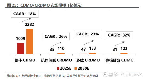 新药放量依托新产能支撑,带动制药上游增长。根据弗若斯特沙利文,全球多肽CRDMO、寡核苷酸 CDMO、抗体偶联(ADC)CRDMO 市场 2025-2030 年市场规模CAGR将分别达到23%、32%、26%,高于CDMO整体增速。新药产能需求的快速增长,将带动包含制药装备在内的制药上游行业快速增长。