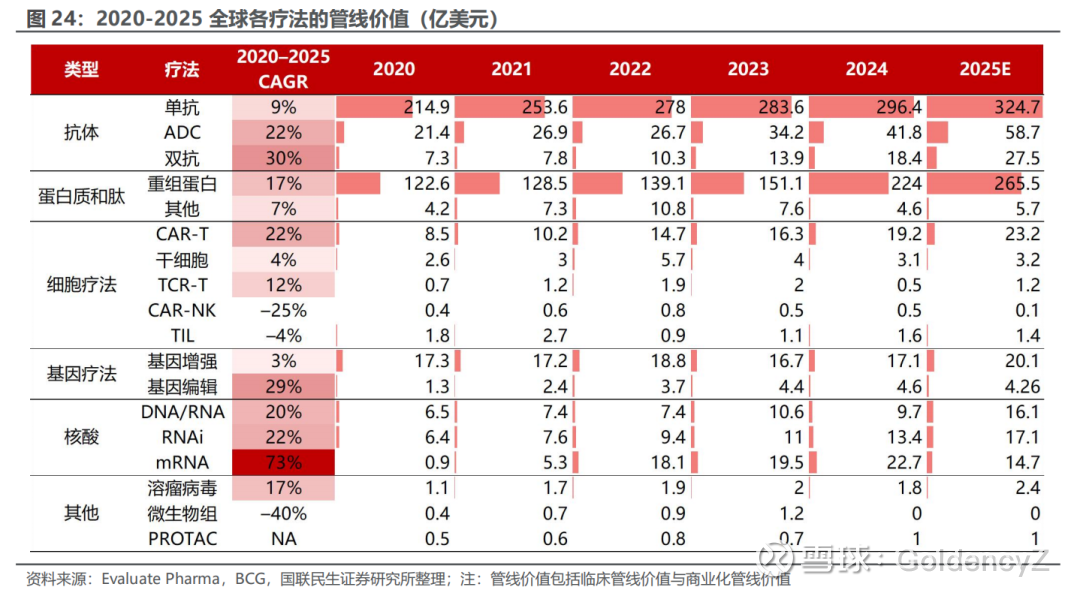 1)现阶段:以单抗、GLP等为主。过去五年,单抗和GLP是制药业主要增长来源,在2025年全球销售额前十的药品中,单抗(Keytruda、Dupixent、Skyrizi、Darzalex)、GLP(Mounjaro、Ozempic、Zepbound、Wegovy)各占四席。