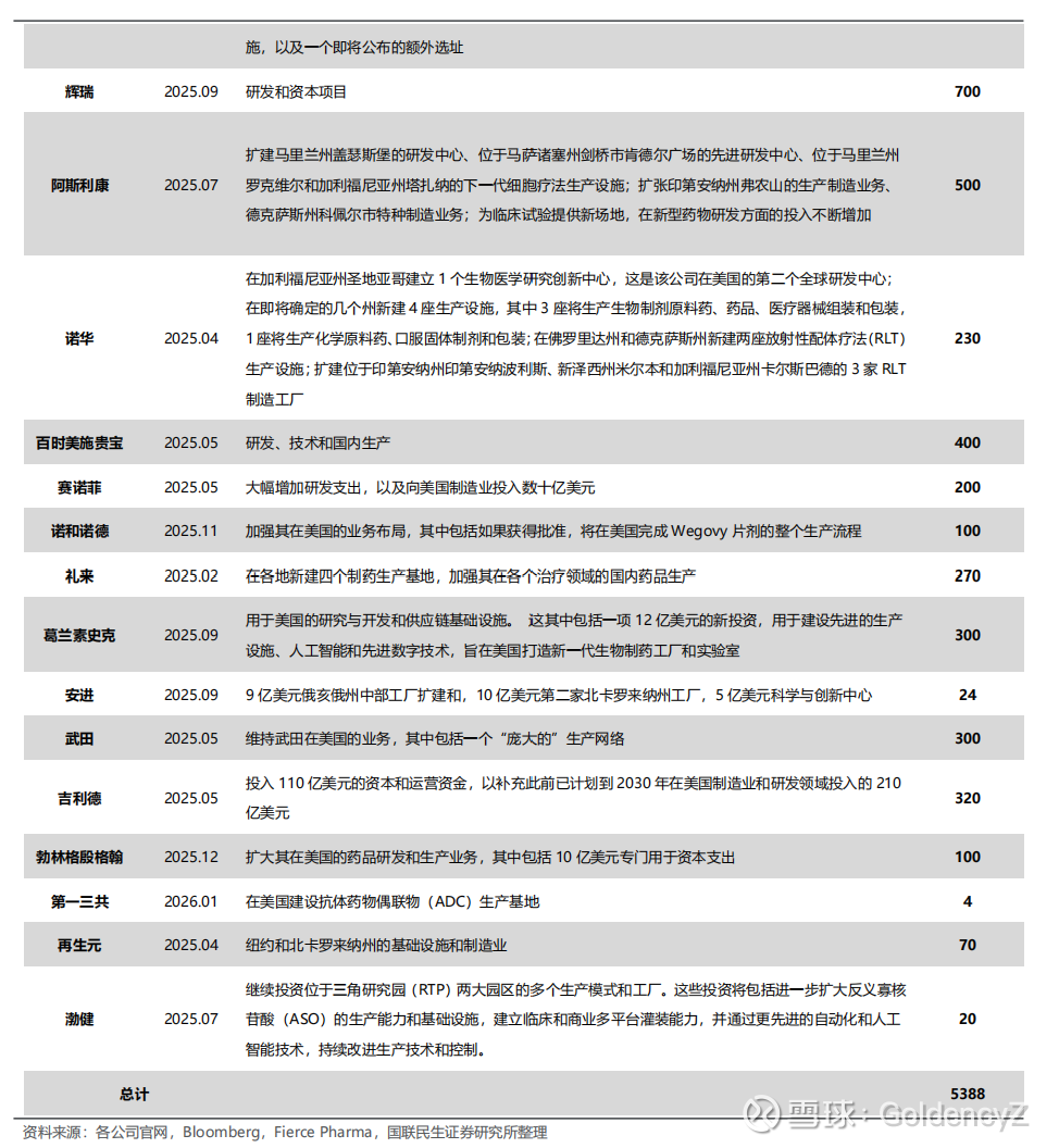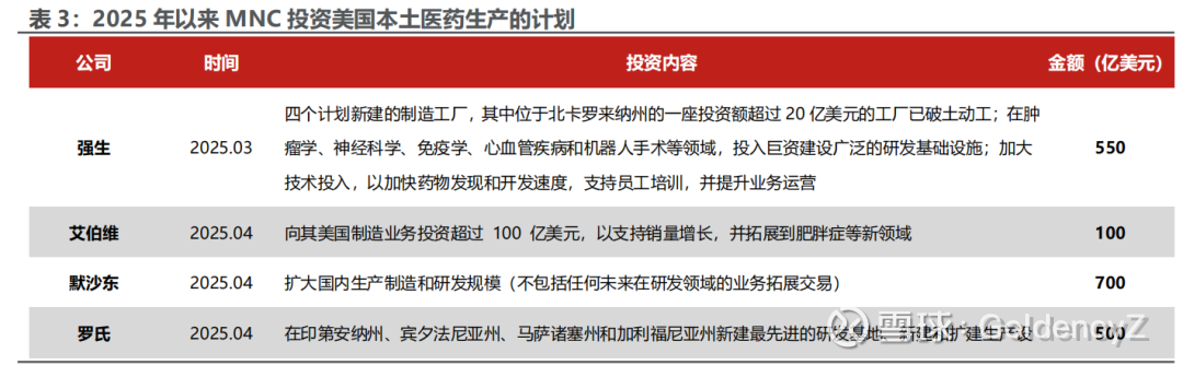 多家制药龙头宣布加码美国本土制药产能扩建计划,投资总额超五千亿美元,产业回流浪潮涌动。制药业是本次美国制造业回流的重点行业,2025年,在美国推动制造业回流的背景下,多家制药龙头企业宣布投资美国本土药品制造的计划,计划投资金额总计近5400亿美元,强生、默沙东、罗氏、辉瑞、阿斯利康等计划投资金额均达数百亿美元。