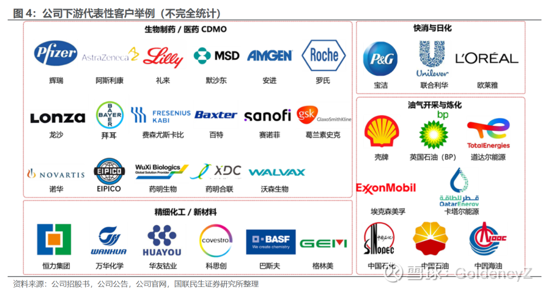 1)制药:默沙东、辉瑞、罗氏、诺华、阿斯利康、赛诺菲、礼来、龙沙、药明生物、第一三共、武田、埃及国际制药工业公司(EIPICO)等;2)石油化工/新材料:壳牌、BP、道达尔能源、巴斯夫、科思创、中国石化、中国石油、中国海油、华友钴业、格林美等;3)日化:宝洁、联合利华、欧莱雅等。