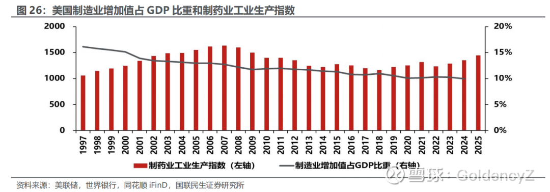 美国政府大力推动制造业回流,驱动药企扩大本土制药产能建设。自上世纪90年代以来,美国制造业附加值占GDP比重持续下跌。2025年,美国将制造业回流作为重点工作推进,其中制药业是本次制造业回流的重点行业。根据美联储公布的美国制药业工业生产指数,2007年以来美国本土药品生产情况呈现下降趋势;2024年以来,随着美国加速制造业回流,美国本土药品生产初显复苏趋势,2025年,美国政府进一步推动各制药龙头扩大其在美国的本土制药产能建设,药企制药产能投资有望迎来新一轮高峰。