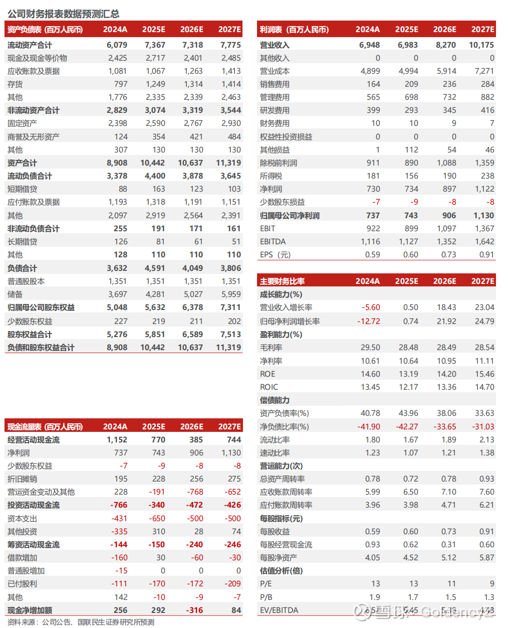 4、动力电池原材料(含矿业冶金):公司动力电池原材料板块包括电动汽车的固态电池等产品,受前期电动汽车产能建设较快影响,行业现阶段短暂调整,公司新签订单有所减少,后续有望逐步恢复增长。我们预测2025-2027年收入增速分别为-17.5%、-17.5%、5.0%,毛利率分别为33.5%、33.5%、33.5%。