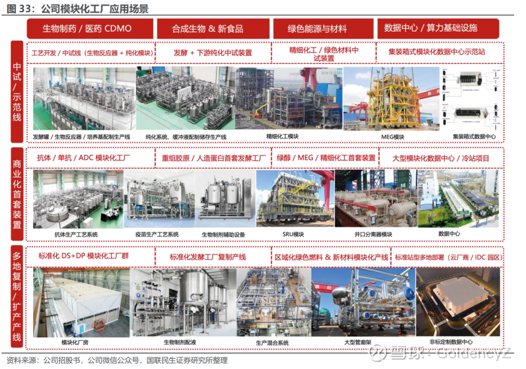 模块化通过施工前移和并行推进,显著提升周期与质量确定性。模块化工厂将大量焊接、安装和联调从工地转移到受控车间,设计、工厂预制与基础土建可以并行推进,整体工期有望较传统方式缩短数月至一年,且标准化工艺与完整制造记录有利于一次性通过GMP / FDA / EMA 等监管审核。在公司的模块化工厂体系下,模块化工厂进一步升级为“厂房+工艺+公用+自控”的整厂级单元。单个模块内同时集成交付所需的空间、工艺系统与公用工程,并预留与数智化平台的接口,叠加高比例工厂预制,使整体方案更适用于对周期、质量和合规要求极高的生物制药、绿色能源等项目。