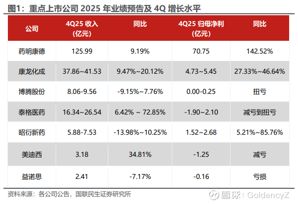 CXO行业处于景气度上行区间,龙头业绩彰显板块兑现能力的确定性与稀缺性。CXO行业龙头在2025年第四季度整体呈现出稳健增长的态势。一体化平台型龙头如药明康德、凯莱英、康龙化成的业绩表现尤为突出,收入稳健增长兼具利润弹性。全球化新药供应链外包趋势下,头部CXO公司凭借其一体化平台、全球化布局及深厚的技术积累,持续获取大订单并优化运营效率,其业绩增长的确定性在当下复杂的宏观环境中较为稀缺。此外,临床CRO及安评等内需主导的方向在2025年四季度均出现边际改善,看好其在2026年度的业绩兑现能力。临近业绩期,我们认为产业趋势确定性较高,横向比较来看主要公司业绩兑现的能力具有稀缺性。