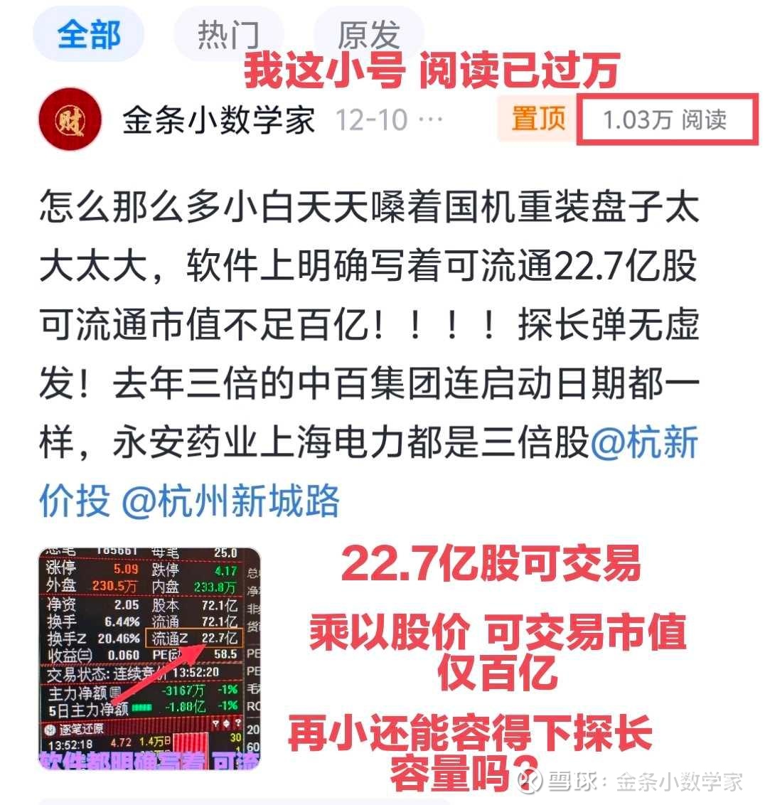 1.杭州新城路大佬首板近3个亿重金开苞(去年同日开苞的中百集团短期三倍成了跨年妖、启动日期都一天没差)、今年中期新城大佬挖掘的永太药业也是短期内在五千家个股阴跌的环境下又是三倍、今年十月份的上海电力,如此大盘子本应僵尸股的生生的又是短期三倍多(十大股东显示大佬一只票就近20亿,至于后来不可抗力走群,大佬硬抗也是回吐了很多很多,温和退场从未恶意砸盘,再说起点人家高喊翻了几倍了,还一辈子不让人卖了?有何可黑?)一个几十万短期靠挖撅 靠格局 锁仓做到了几十亿的大佬,比各种鸡狗减持 比各种砸盘游资强几倍几十倍吧?比量化收割强了百倍千倍吧?