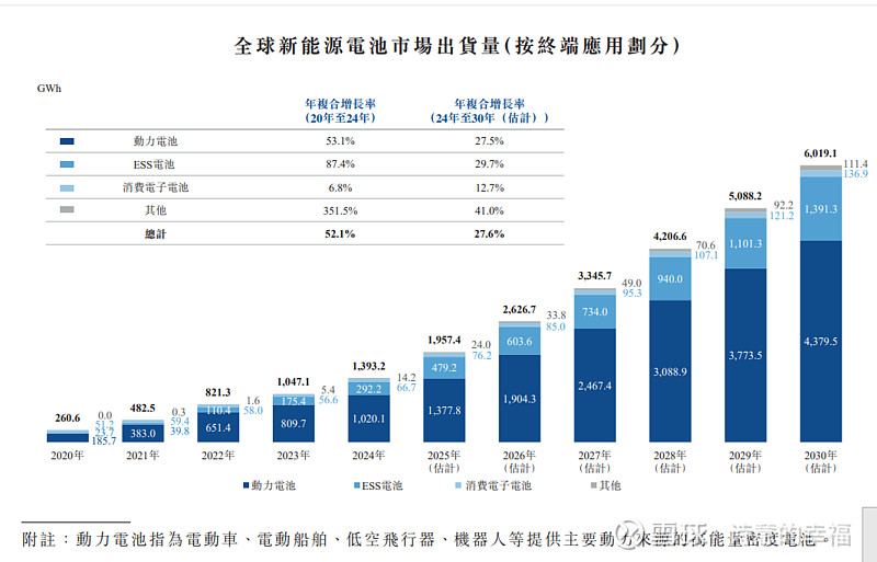 新能源电池市场的主要终端应用包括动力电池、ESS 电池及消费电子电池。新能源电池的出货量由 2020 年的 260.6 GWh 增加至 2024 年的 1,393.2 GWh,预计到 2030 年将进一步增加至 6,019.1 GWh,2024 年至 2030 年的年复合增长率为 27.6%。
