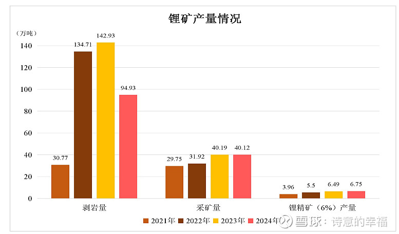 2024年公司锂矿采选业务持续提升生产效率,锂精矿产量屡创新高。报告期内,公司锂矿采选业务累计采剥总量 135.05 万吨;累计生产锂精矿(6%品位)6.75 万吨,同比增长 4.07%,