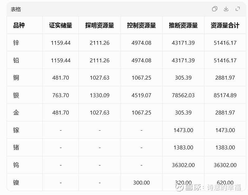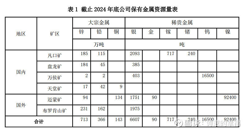 公司所属矿山保有金属资源量锌713 万吨,铅 366 万吨,铜 143 万吨,银6607 吨,金90 吨,镍9.24万吨,镓 717 吨,锗 240 吨,钨 1.65 万吨。